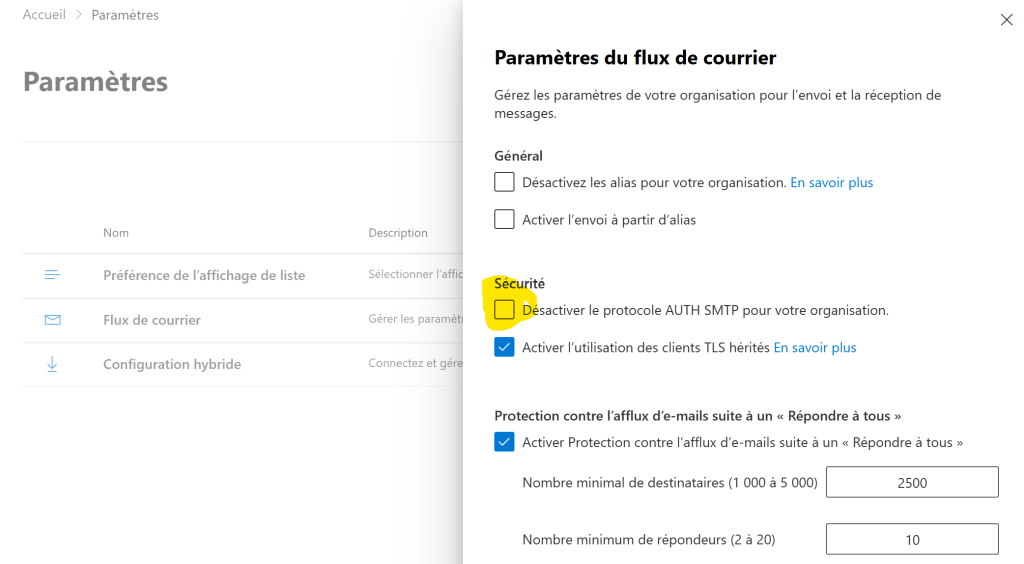 Vous devrez alors vérifier que le MFA est désactivé (point 1) et le SMTP authentifié activé (point 2).