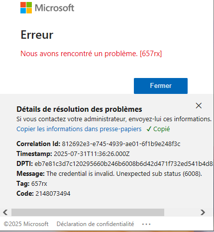 - Dans les paramètres windows > comptes > accès professionnel ou scolaire, assurez vous que le compte en question n’y apparaisse pas, sinon deconnectez le également